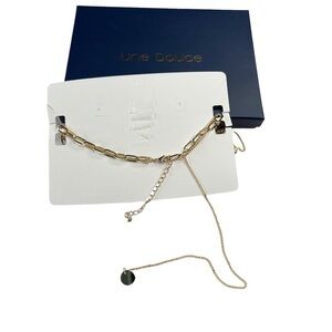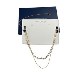 New Une Douce Gold Tone Double Stranded Chain Link Necklace. In new condition and comes with a gift box. 1 open chain link necklace and a thin dainty chain that hangs underneath it. At the back hangs the dainty chain with a gold tone disc at the end. Lobster claw closure. No precious metals or gems. Perfect to wear as a layered look.