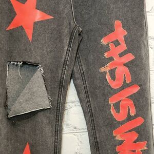 New Unidrone Small Gray and Red Graffiti Ripped Distressed Jeans Straight Leg