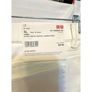 The product is a pair of Uniqlo XL women's white ultra-stretch cropped pull-on leggings. These leggings are perfect for casual occasions and are easy to care for with machine washable fabric. The cropped style adds a trendy touch, while the stretch feature ensures a comfortable and flattering fit. Ideal for everyday wear or for working out, these leggings are a versatile addition to any wardrobe.