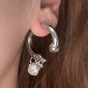 Another Unique Pair of Pierced Earrings adorned with Dangling Faux Mabe Pearls in Silver Tone Metal. Can be worn with the pearl or without. We carry NEW & VINTAGE Quality, High End Jewelry, Luxury Fashion Design specializing in Unique, Runway, Popular, Cruise, Festival Chic, Contemporary, Goth, Brutlist, Mixed Metals, Prom, Wedding & Bridal, Minimalist, Trending Jewelry and Rhinestones Galore! Including Styles from Zara, Bauble Bar, Ippolita, Anthropologie & Great Holiday Gift Trend ideas too!!Lizzie Fortunato, Effy, Shashi, Alexis Bittar & GREAT HOLIDAY GIFT Ideas too!!!