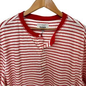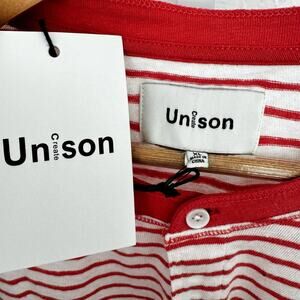 Brand New with Tags Unison Men's Orange Burnt Siena White Striped 3 Button Short Sleeve Crew Neck Henley Cotton Linen Blend MSRP: $79. Size: XL