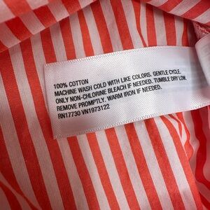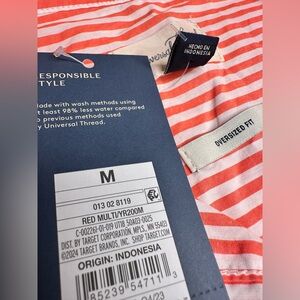 This is a new Women's Top by Universal Thread in size M. It features a striped pattern in red multi stripes, long sleeves, a collared neckline with a button-down closure, and pockets. The blouse is made of 100% cotton and is machine washable. The style is basic with a regular fit, suitable for casual occasions. The brand is Universal Thread and it is not a vintage item.