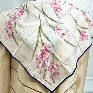 #73 New Unused TRUSSARDI 100% Scarf Silk/Cotton Square 19” x19" color light pink green flroral with navy blue trim , made in Italy. Condition, very good , little stain oNewr dott or dirt, Unused, long term storage. Sell As Is