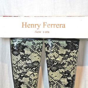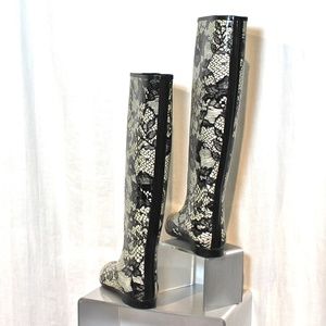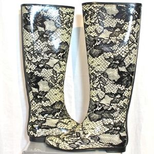 New Henry Ferrera knee high Black & Ivory Lace Print Rain Boots