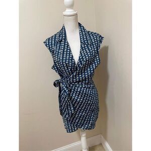 Blue Urban Outfitters boho retro mini wrap dress with ivory color butterflies print. Fitted with a surplice collared neckline, short cap sleeves and adjustable tie closure at the waist. Inside waist 3 button closure. Lightweight.