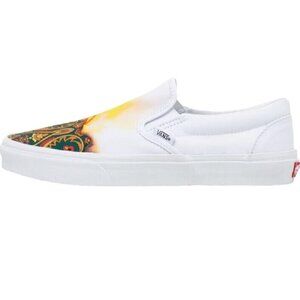Step up your style game with the New VANS Slip-On Canvas Big Reveal Paisley Women's Shoes. Inspired by the iconic skater look, these slip-ons combine comfort and fashion effortlessly. The shoes feature a striking paisley design that offers a unique burnt-effect reveal over a classic white canvas background. Made with high-quality canvas material, these shoes are durable and breathable, perfect for everyday wear. The rubber waffle outsole provides excellent grip and flexibility, making them ideal for skating and casual outings. Available in size 5, these Vans offer a snug yet comfortable fit. Slip into these trendy shoes and express your individuality with a bold, eye-catching design. Perfect for anyone looking to add a touch of originality to their wardrobe.