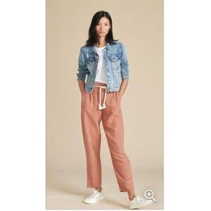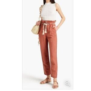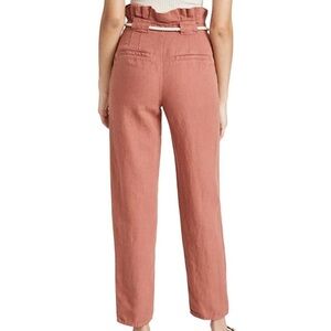 Fabric: Mid-weight, non-stretch twill Pleated paper bag waist -Optional braided tie at waist -Button closure and zip fly Slant front and faux welt back pockets Shell: 55% cotton/45% linen Wash cold or dry clean