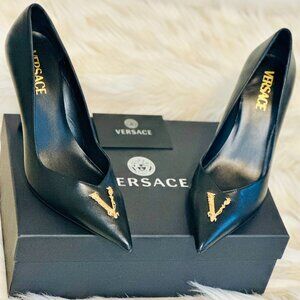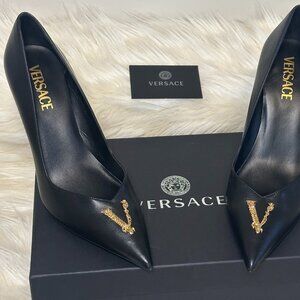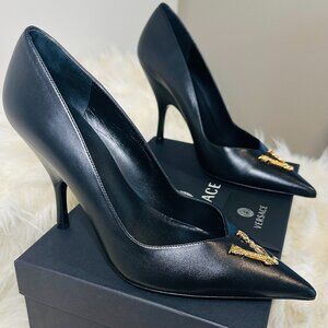 Unworn and in pristine condition, these Versace Virtus Leather Pumps in black, US size 9, bring refined drama to any outfit. Crafted in Italy from smooth, premium leather, they feature a pointed toe, sculpted stiletto heel, and bold gold-tone Barocco V emblem that channels unmistakable Versace attitude.
