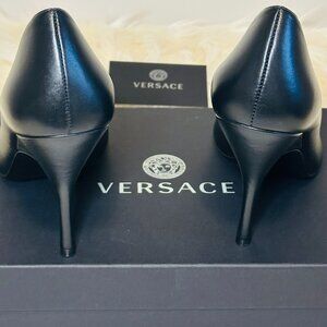 New VERSACE Virtus Leather Pumps In Black & Gold, Size EU 39 (US 9), NIB