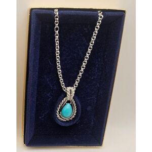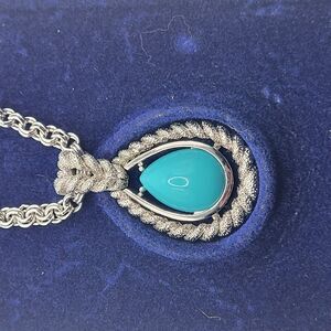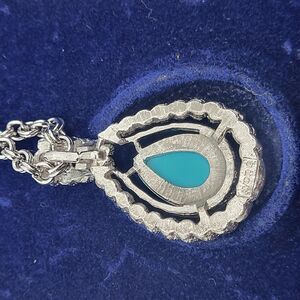 New VTG Avon Blue Teardrop Turquouise Silver tone Necklace 40in - matching earrings also listed | Materials: acrylic, silver metal alloy | Length: 40in chain, 1.75in pendant | Clasp: spring ring | Signed? Avon Fashion Accents Blue Teardrop Necklace with Adjustable chain 1972 | New in Box