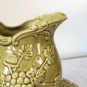 A beautiful brand new vintage mustard yellow/green pitcher and bowl featuring cluster of grapes and leaves design. Original gold labels are still attached at the bottom of both pieces. Made in Japan. Original store label is also attached at the bottom of the bowl. This set was purchased at Schultz Bros Co which filed for bankruptcy in 1988 (You can Google it.). So this set is estimated at least 34 years old. You can use this set for coffee creamer or add them to your vintage pitcher and bowl collection. No chips or cracks. Please feel free to ask any questions.