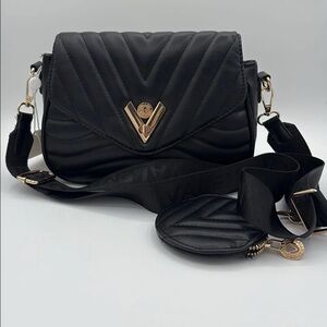 Elevate your wardrobe with this authentic Valentino Orlandi quilted crossbody purse. Crafted with a sleek black chevron-stitched design and gold-tone hardware, this bag blends luxury and everyday practicality. Features a detachable wide logo strap embossed with Valentino Orlandi, a round zip coin pouch, and an elegant "V" front clasp closure.