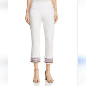 New!! Valerie Steven's White Cropped Capri Pants. Beautiful Red, Navy Stitched Design at Hem. Hidden Elastic Stretch Waistband For Ultimate Comfort.
