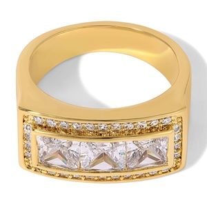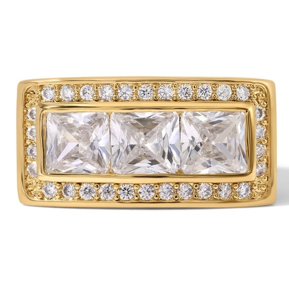 Features a bold cocktail ring with 3 large square-cut crystal CZs framed by small CZs upon a thick band. Made from 24K gold-plated brass.