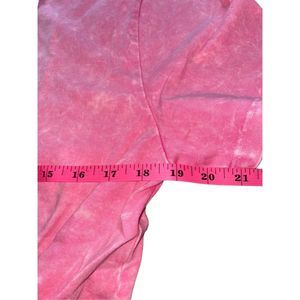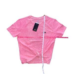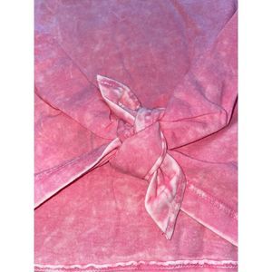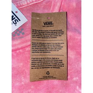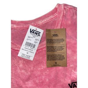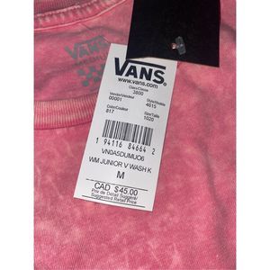 This listing is for a new tee from the brand Vans in junior size medium. The tee is a mineral or acid wash pink color with a black VANS logo on the upper left. There is a tie front giving it a slightly shorter front. The material is 100% cotton.
