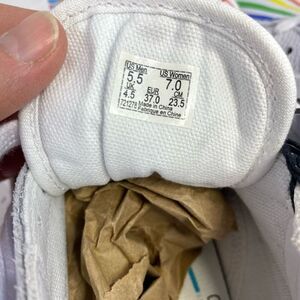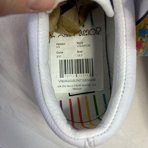 Vans "Off The Wall" X Flour Shop by Amirah Kassem. White leather uppers with rainbow accents. Leather Rainbow Striped Sneakers. Lace up closure with a white fabric interior with a rainbow printed insole. These shoes are unisex. Men's size 5.5 and women's size 7.
