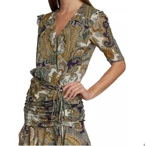 New Veronica Beard Dakota Ruffled Paisley Print Silk Chiffon Mini Dress Green 2