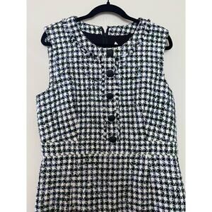 Crested buttons elevate this textural tweed dress crafted in a polished check pattern with a playful fringe-trim neckline.