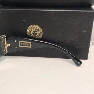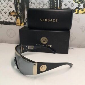 New Versace™ VE2197 Shield Sunglasses – Gold Frame / Grey Mirror Lenses Elevate your accessory game with these brand new, authentic Versace™ VE2197 shield sunglasses. Featuring a striking semi-rimless gold frame paired with grey mirrored lenses, this bold statement piece offers a sleek blend of Italian luxury and modern edge. Details: • Condition: New • Gender: Unisex • Frame Color: Gold • Lens Color: Grey (Grey Mirror Silver) • Frame Shape: Irregular / Shield • Frame Material: Metal & Plastic (Semi-Rimless) • Measurements: • Lens/Front Width: 40 mm • Bridge / Frame Width: 140 mm • Arm (Temple) Length: 130 mm • Made in Italy • Includes: Versace case, cleaning cloth, certificate of authenticity Stylish, versatile, and undeniably luxurious—these sunglasses are perfect for those who want to stand out with designer flair.