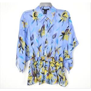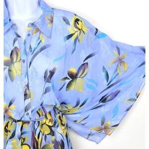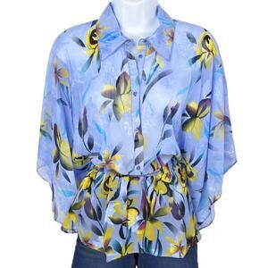 New Vertigo Floral Print Smocked Waist Kimono Sleeve Button Front Chiffon Blouse