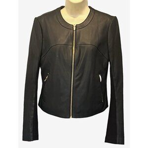New Via Spiga Black Leather Stretch Fabric Combo Zip Moto Jacket