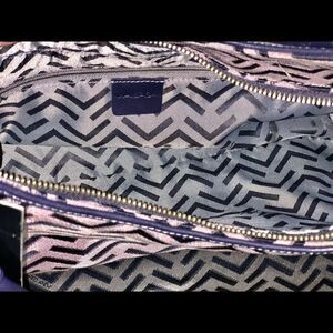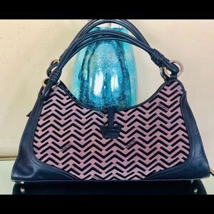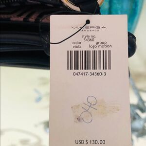 New with Tags Via Spiga Handbags Fabric Leather Trimmed, Silver Hardware, Four Bottom Feet. Top Zipper Closure, Front Leather Disc Magnetic Closure. Double Leather Straps 8.5”, Height 7.5”, Length 15”, Depth 3”. Inside one Zipper Pocket, Fabric Lining.