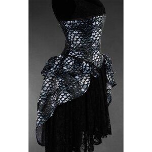 Satin dragon scale detail- Attached high-low, layered, back open slit bustle style skirt- Back lace-up- Spiral steel boning- Corset lined in 100% cotton canvas (Note: black lace skirt shown under corset skirt in photos is a different product and not attached/included.)