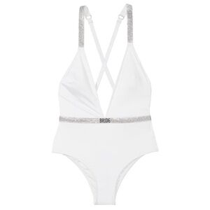 Elegant white one piece with cross straps. Features a sparkling belt detail with BRIDE in rhinestones.