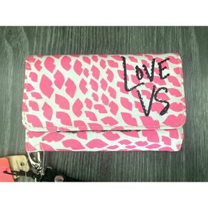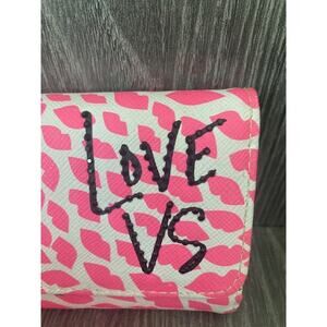 This wristlet wallet is white with an adorable pink lip pattern all over. It has a black textured "LOVE VS" on the side. It Measures 5" H (when closed) X 3" W. It has a tri-fold style and comes from the Victoria's Secret collection. Made of faux leather.