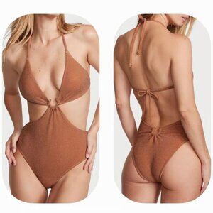 New! Victoria’s Secret Tan Shimmer Halter Cutout One Piece Swimsuit 3536