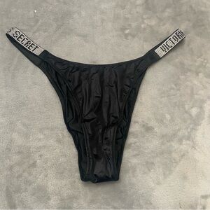 Black satin panty with rhinestone embellished logo straps. New without tags!
