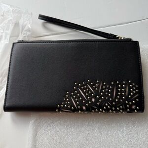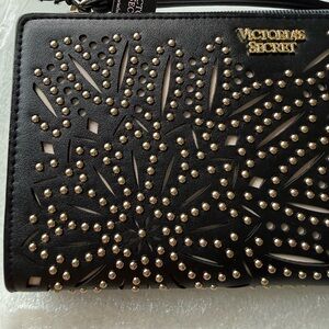 Victoria's Secret black laser cut gold tone studs wristlet wallet. 8" x 4". Faux leather. This is my price.