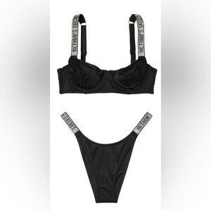 Black underwire bikini top with rhinestone embellished logo straps and matching Brazilian cheeky thong bottom. New without tags!