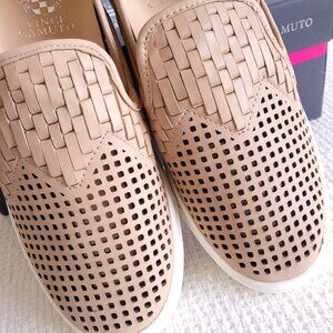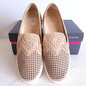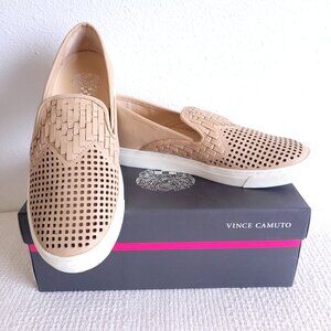 New Vince Camuto "Bristie" Women's Slip-On leather Sneakers in tan (called Natural. Vince Camuto lends a huarache feel to the classic slip-on silhouette of the Bristie platform sneakers with perforations and woven stitching details. Features 3/4" platform, Round-toe slip-on platform sneakers, Perforations and woven details at upper, smooth Leather upper; manmade sole. Brand new never used with box!