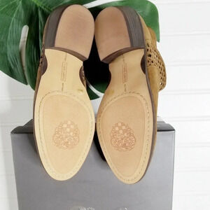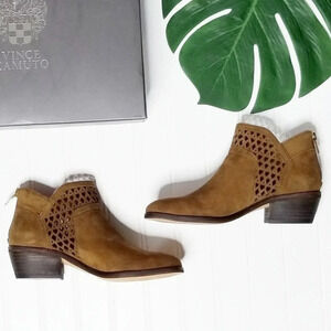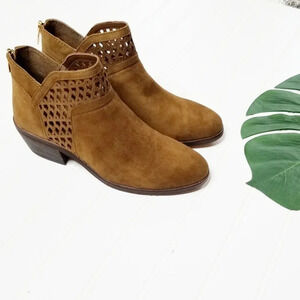 New in Box Vince Camuto brown leather Perdula ankle boots. Features geometric perforation design. Back zip closure.