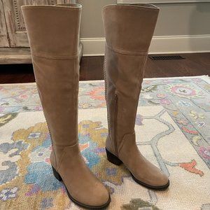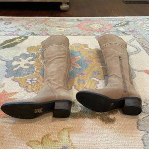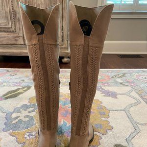 I bought these boots a few years ago and just never wore them. I no longer have the box, but I have stored them with inserts to keep the shape. Light beige color and stretches to fit larger calves. Size 6. I love them but my feet have widened and I can't wear. All items come from a pet free, smoke free home.