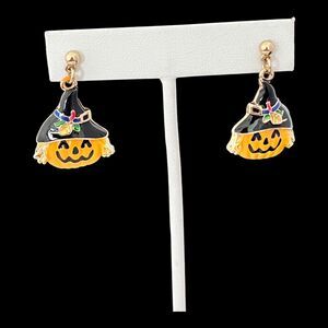 New Vintage Halloween Pierced Earrings Hand Enamel Jack-O-Lantern Witch Hat 10Z