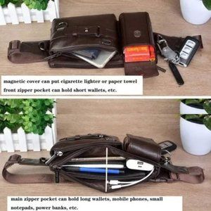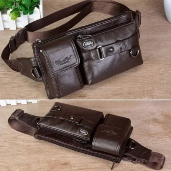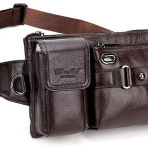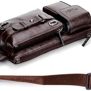 Genuine Leather Cowhide(High Quality); with polyester lining. Aged color,a fanny pack without looking like you've completely given up on the concept of fashion