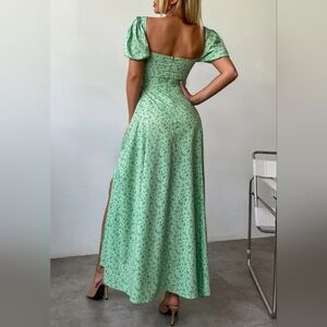 New Vintage Look Floral Tie Ruched Top Split Maxi Dress Green