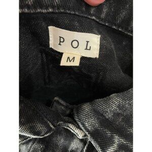 This POL denim jacket exudes a vintage vibe with its distressed black wash and raw hemline. The medium fit flatters various body types, making it a versatile addition to any wardrobe. Its button-front closure and classic collar add timeless appeal, while the unique design enhances any outfit effortlessly.