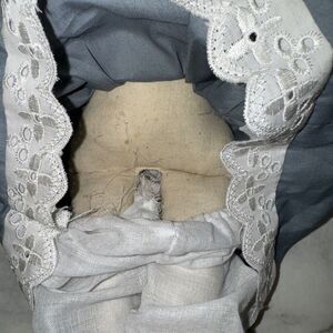 This was preowned it was on display however, her limbs are all wrapped up in original packaging until I made this listing. I included the photo of how they were packaged before I took them off. I do not know the maker I would assume that this is from the 1980s. Her limbs and head are porcelain and extremely heavy. Her body is soft but firm and has some thing bendable in it so you can bend her to sit you can bend her arms to stick out you could bend her knees a bit. 20 inches tall her pants have lost their elasticity in the waist and her left leg, which I think is dry rotted from age. Also a rip at the lace bottom on her left leg as shown in the picture that's easy to hide and it's the same so it's easy to fix if you want to. the dress has beautiful lace at the bottom her apron are detachable and they are discolored yellow her is also discolored yellow, but that is not removable. It is glued on. There's no cracks, no chips, no Nicks, no damage Porcelain at all. A lot of quality to this was produced handmade.