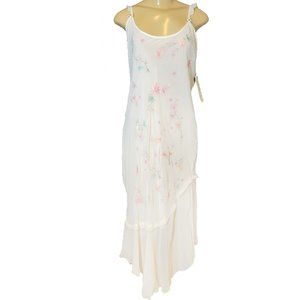 The Maxi Long Nightgown features Ruffle spaghetti straps a small bow with rhinestones in the middle of each. V Neck. The Gown is double lined, Embroidered with pretty floral details in pastel colors such as Pink, Yellow and green. The Robe is midlength and has a sash that ties this set together nicely. A stunning piece, both have tags attached. Asymmetrical Ruffle hem at the bottom.