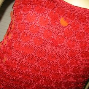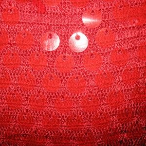 Seller Notes: With red sheer round disks all over the knitted crochet fabric.