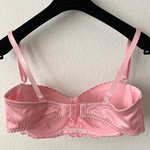 New. Never worn. Vintage lace bra in pink. Embroidery is a mirrored reflection on either side. Removable straps. Padded with slight push up. Balconette/ demi cup. Size tag removed. Approx 34C; 12” underbust measured flat at smallest setting. 29” outer circumference.