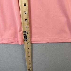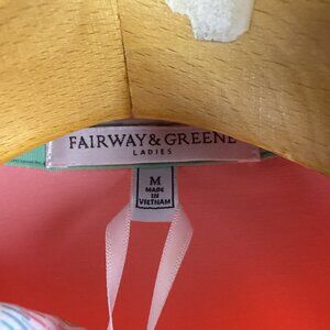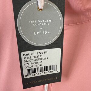 The product is a new Fairway & Greene Darcy Sleeveless Polo for women in size M. This stylish shirt features a stand-up collared neckline, pullover closure, and is designed for all seasons with moisture-wicking and breathable fabric. The shirt is made of polyester and spandex, ensuring a comfortable fit for athletes. The pink color, solid pattern, and subtle logo accents make it suitable for both activewear and casual occasions, perfect for golfing in the summer, fall, and spring.