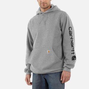 This hoodie is crafted from a comfortable cotton blend midweight fleece, making it suitable for year-round wear. The pullover design includes a drawstring closure, a hooded neckline for added warmth, and a front hand warmer pouch for practicality. The graphic Carhartt logo sleeve print brings an outdoor-inspired style to the garment.