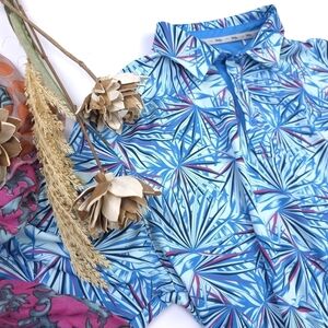 Stylish polo shirt with a vibrant blue and white pattern. Perfect for casual outings.