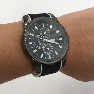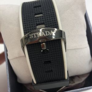 New Strada water resistant watch. Large face is 1.5” wide. Black silicone band is .75” wide. Comes in gift box with new battery.