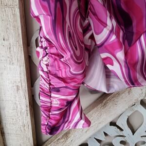 Size medium fuchsia swirl Topanga ruched long puff sleeve satin top by Wayf.