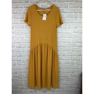 Casual mustard yellow dress with short sleeves,scoop neckline, ribbed design and flowy skirt